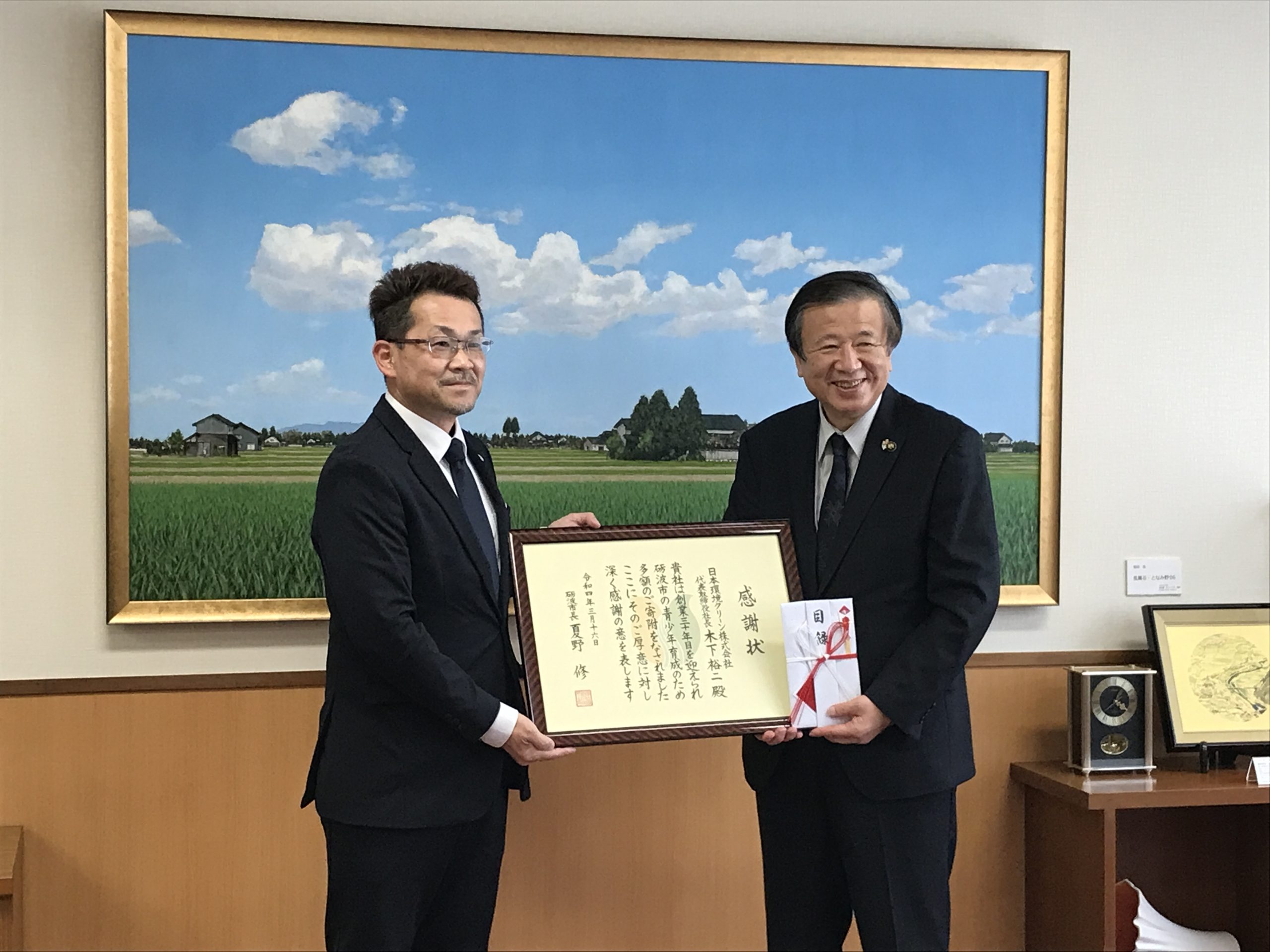 - 16日(水) 日本環境クリーン㈱創業30年記念青少年育成寄附金受領および感謝状贈呈式<市長応接室>